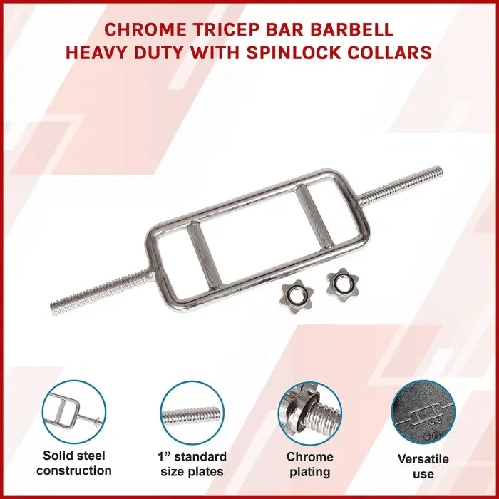Our Chrome Standard Solid Tricep Bar is the perfect addition to any home or commercial gym. It is made with high-quality chrome-plated steel, ensuring that it can withstand even the toughest workouts. Its knurled handles provide a secure grip, while its angled design targets the triceps for maximum effectiveness. Our bar fits standard weight plates, making it easy to add or remove weight as needed. Whether you're a beginner or a seasoned weight lifter, our Chrome Standard Solid Tricep Bar is an essential tool for building strong, defined triceps.